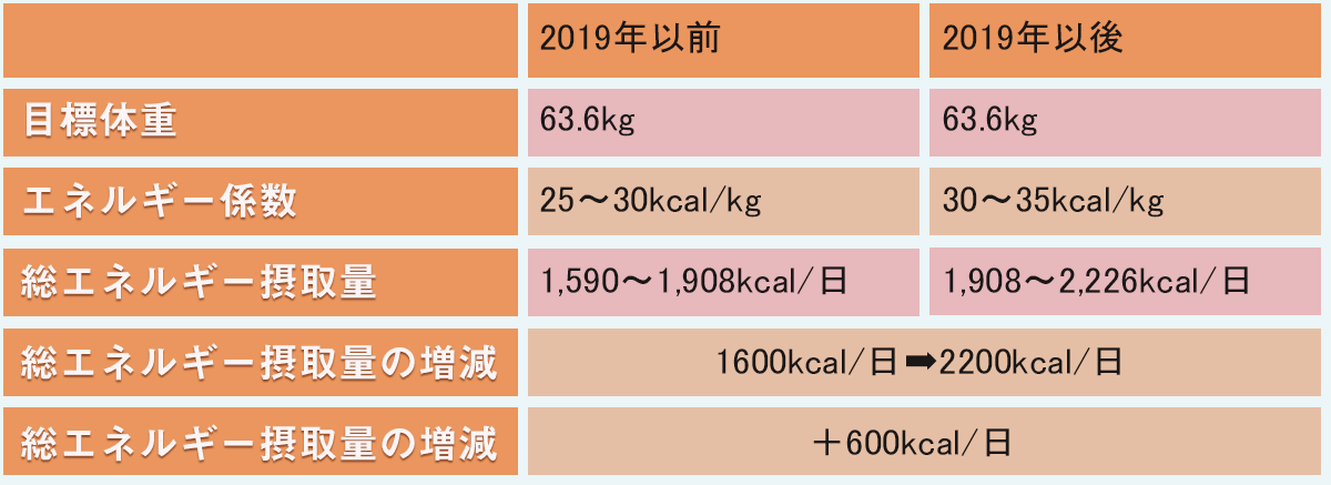 このようなエビデンスを踏まえ、2019年以降は総エネルギー摂取量の設定がより現実に即したものに変化していった。