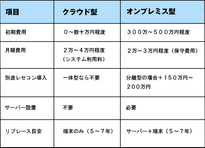 保守契約の内容はメーカーによって異なるため、どこまでが月額に含まれるのかを契約前に必ず確認してください。また、オンプレミス型はシステム設定や初期指導が初期費用に含まれていることが多いのに対し、クラウド型では設定サポートが別料金になるケースがある点にも注意が必要です。