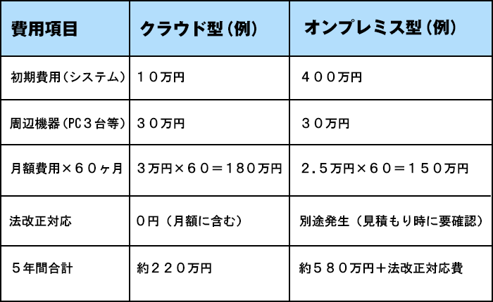 5年間のTCOで見ると、クラウド型とオンプレミス型には大きな差が出る傾向があります。クラウド型を選ぶ場合でも、将来のスタッフ増員や分院展開を視野に入れているなら、利用者増加時の料金変動もあらかじめ確認しておくことが重要です。