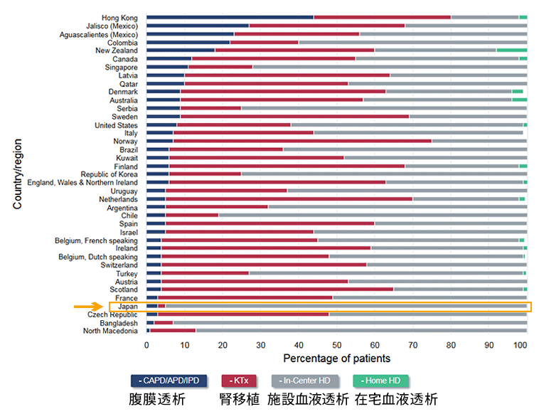 腎代替療法にはHD、PD、腎移植があるが、USRDSのデータによると、海外諸国では日本に比べて腎移植が非常に多く、PDも一定程度行われているが5)、我が国では透析患者の約97%がHDを選択しており3) 5)、腎移植とPDが極端に少ない特殊なバランスのモダリティで治療が行われていることがわかる。